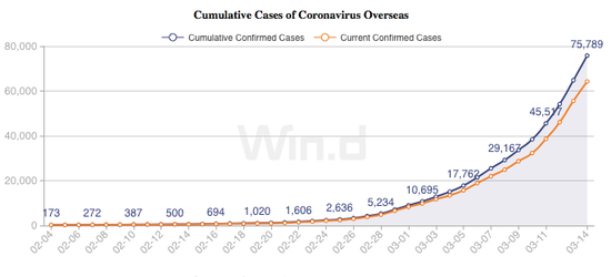 截至北京时间3月15日12时,除中国外,140多个国家和地区累计确诊75789例新冠肺炎,中国以外10个国家确诊过千。