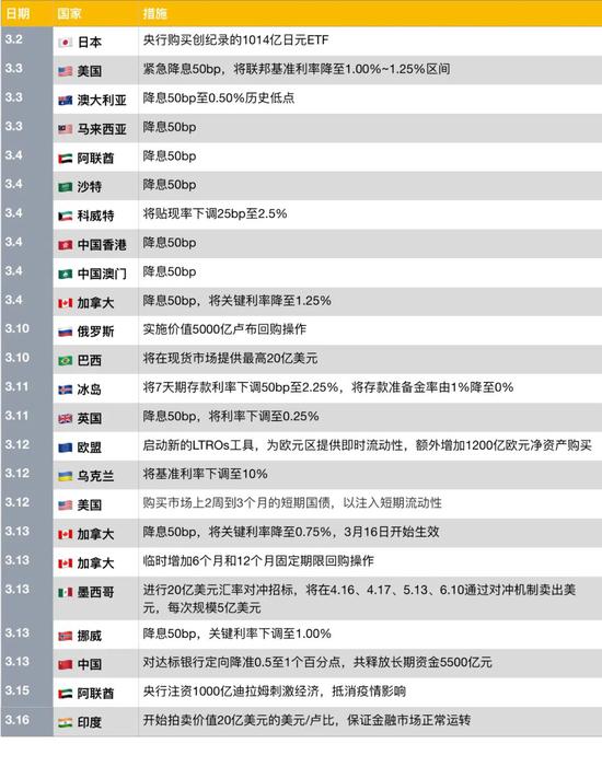 市场一片腥风血雨下,全球央行紧急出手干预。从3月3日美联储紧急降息50bp以来,已经有10几个国家央行开始行动,降息、资产购买同步进行。