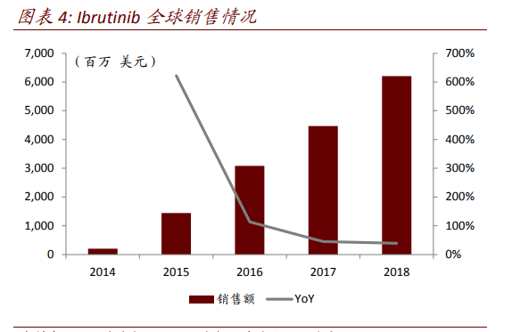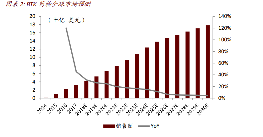 自 2014 年第一款 BTK 药物 Ibrutinib 获批上市以来,实现快速放量,2018 年全球 BTK 抑制剂销售额已超过 63 亿美元,未来BTK抑制剂的总销售额可能超过百亿美元。