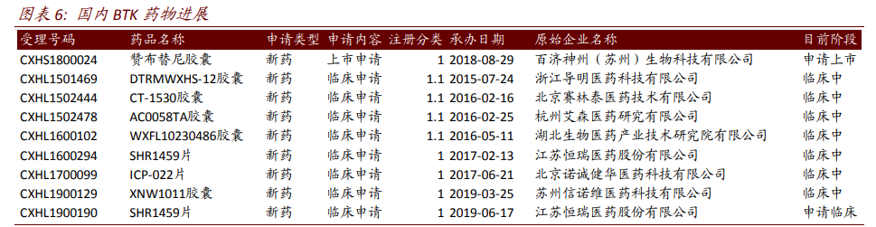 目前,全球仅有两种BTK抑制剂获批,分别是強生╱Abbvie的IMBRUVICA® (ibrutinib)及AstraZeneca的CALQUENCE® (acalabrutinib)。Ibrutinib于2013年获美国FDA批准上市,2017年于中国获批上市。acalabrutinib于2013年获美国FDA批准上市,并未进入中国市场。