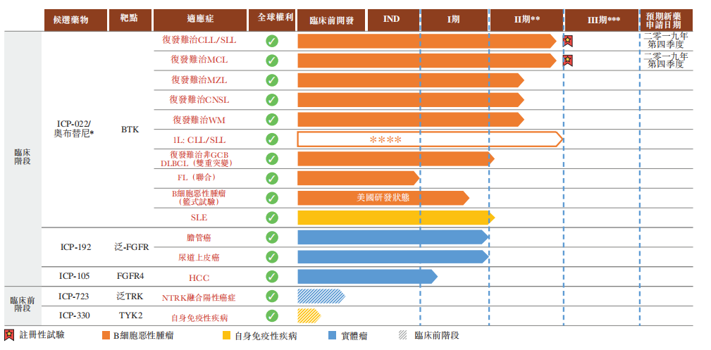 目前,诺诚健华团队发现并研发了有9种候选药物,包括3种临床阶段候选药物和6种处于IND准备阶段的自主研发候选药物。其中,奥布替尼(ICP-022)研发进度最快,是当前在中国及美国广泛临床计划中接受评估的,一种潜在同类最佳、高选择性及不可逆BTK抑制剂,用于治疗多种B细胞恶性肿瘤及自身免疫性疾病。