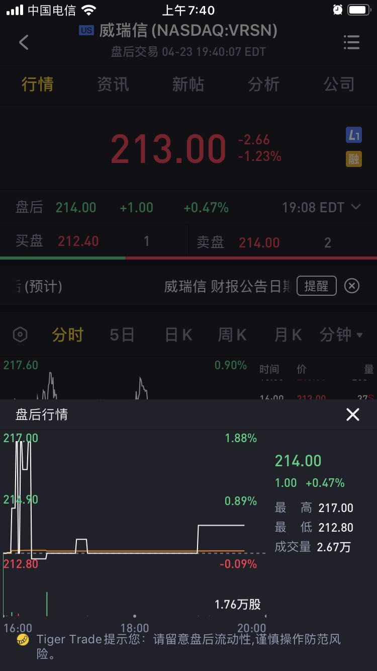 截至发稿,威瑞信盘后涨0.47%,报214美元。营收为3.12亿美元,同比增长2%。
