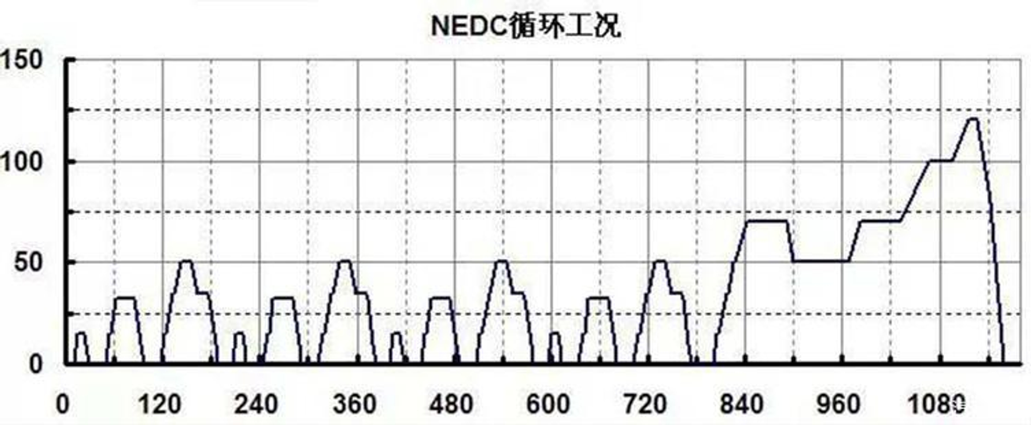 NEDC循环包括两种工况:第一种是城市道路频繁启停的城市工况,模拟通过三个间隔距离不同路口均遇到红灯等待的驾驶情况,测试中最高车速50km/h,平均车速19km/h。第二种是城郊快速道路通行的市郊工况,市郊工况测试环境中最高车速为120km/h,平均车速63km/h。