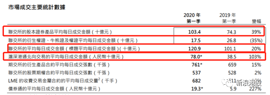 根据公司公告,港交所主要业务收入较 2019 年第一季上升 19%,主要由于平均每日成交金额增加20%带动交易及结算费增加。2020 年第一季来自沪深港通的收入及其他收益创下4.04 亿元季度新高,较 2019 年第一季增加74%。沪深港通的北向及南向交易的平均每日成交金额同创季度新高,分别达人民币780亿元及216亿港元。