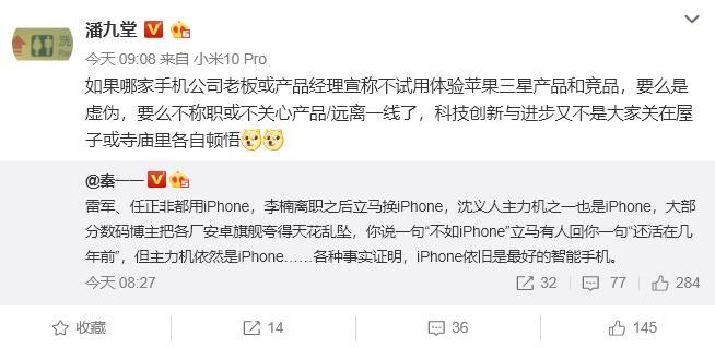 看到大家热议之后小米高管@潘九堂 称:如果哪家手机公司老板或产品经理宣称不试用体验苹果、三星产品和竞品,要么是虚伪,要么不称职或不关心产品/远离一线了,科技创新与进步又不是大家关在屋子或寺庙里各自顿悟。