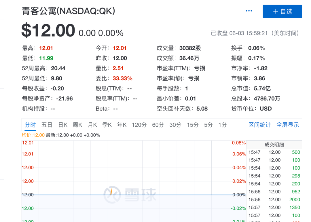 另外,上市之后的青客公寓股价表现并不理想。通过观察其股价走势可以发现,二级市场的股民对青客似乎并不感兴趣,甚至还出现过一天之内股票零成交的情况。如今,青客公寓的股票交易已经陷入停滞,公司市值也仅剩5.74亿美元。