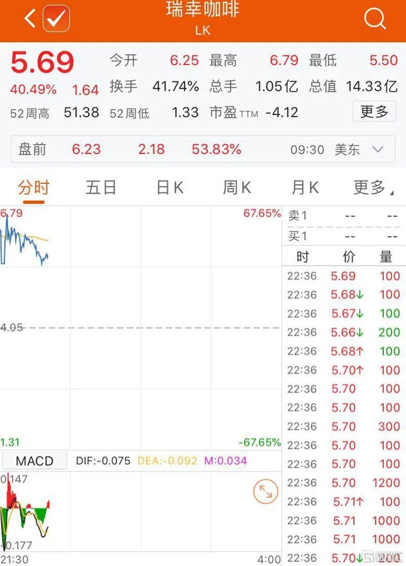 中概股集体大涨,瑞幸咖啡延续前一交易日走势,盘中暴涨并触发熔断机制,恢复交易后涨幅扩大至60%以上。截至发稿,瑞幸咖啡市值超过14亿美元。