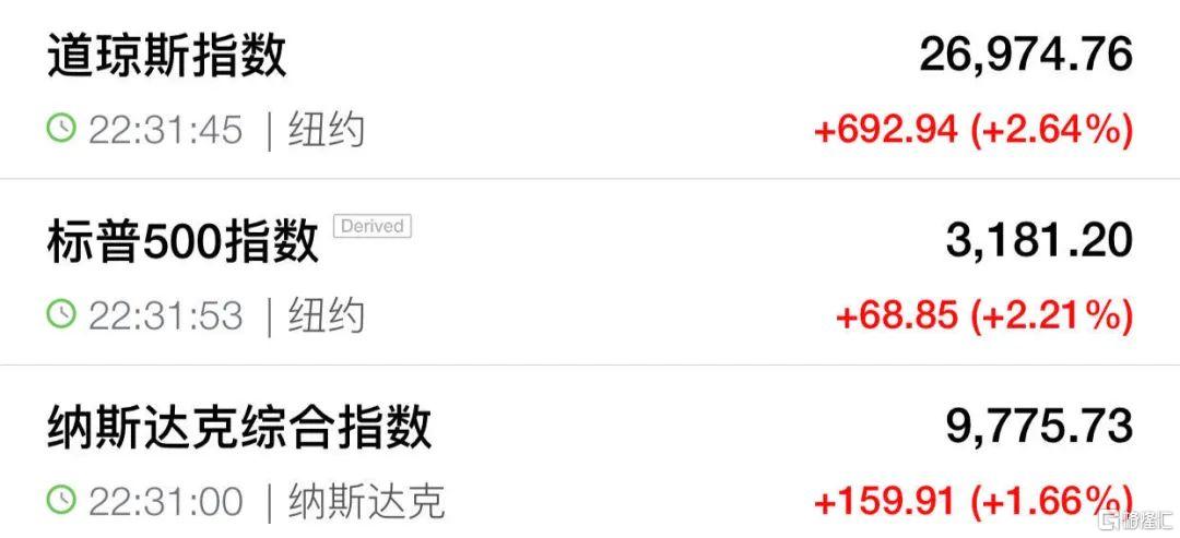 美三大股指大幅高开,道指开盘涨近700点,随后持续走高。截至北京时间22时20分,道指涨幅触及3%,最高涨超750点;标普500指数涨2.23%,纳指涨1.53%。