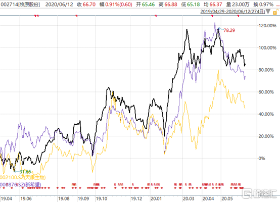 当然,包括三文鱼在内的海鲜肉食受到波及,对于猪肉股存在事件情绪的利好。4月底来看,牧原股份累跌下跌14%,新希望累跌20%左右,跟5月份以来的生猪价格下降有关,背后是消费需求相对疲软。