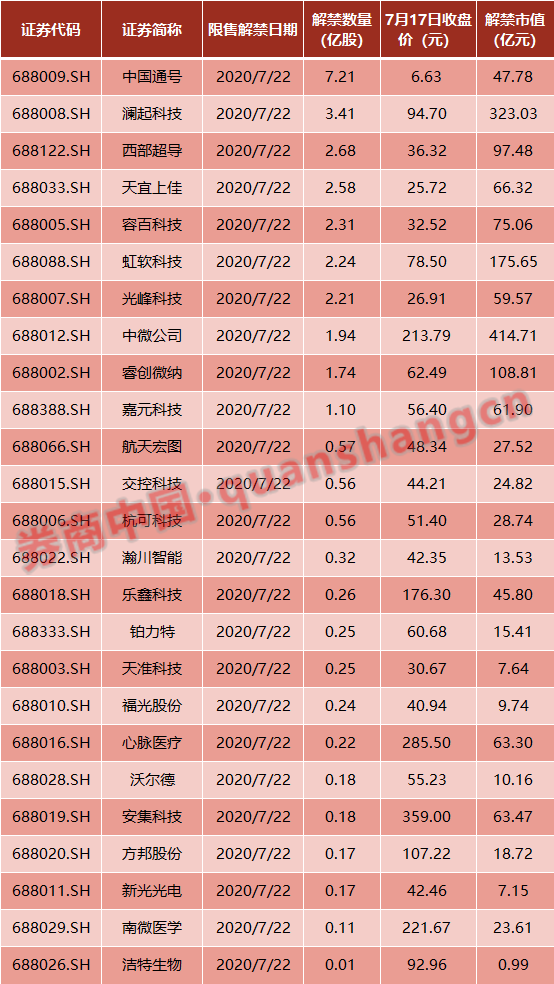 根据wind数据统计,这批科创板解禁市值按上周五收盘价计算超过1790亿元。其中,解禁市值最大的为中微公司,达414亿元以上,澜起科技、虹软科技、睿创微纳解禁市值皆超100亿。