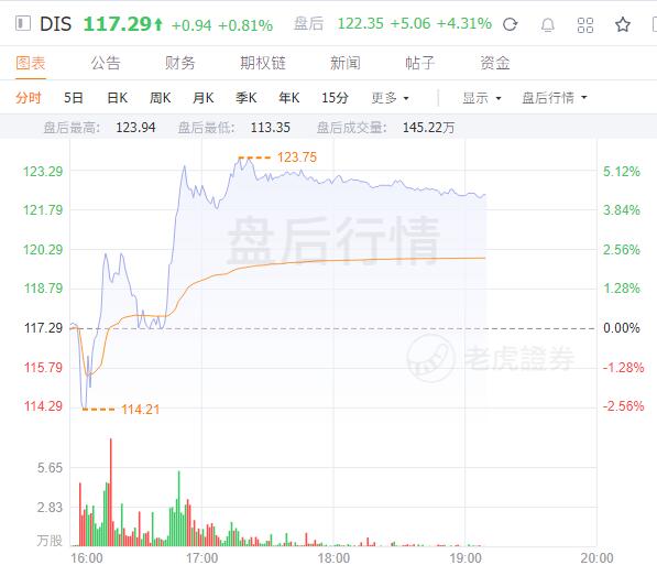 财报公布后,迪士尼股价盘后一度大跌3%,截至目前涨4.31%%。该公司股价周二收涨0.81%,报117.29美元。