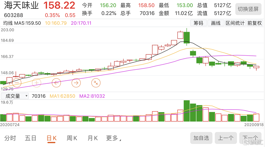 截至今日收盘,海天味业股价为158.22元/股,涨幅为0.35%,相较于9月3日的高光时刻,市值蒸发超近1400亿元。
