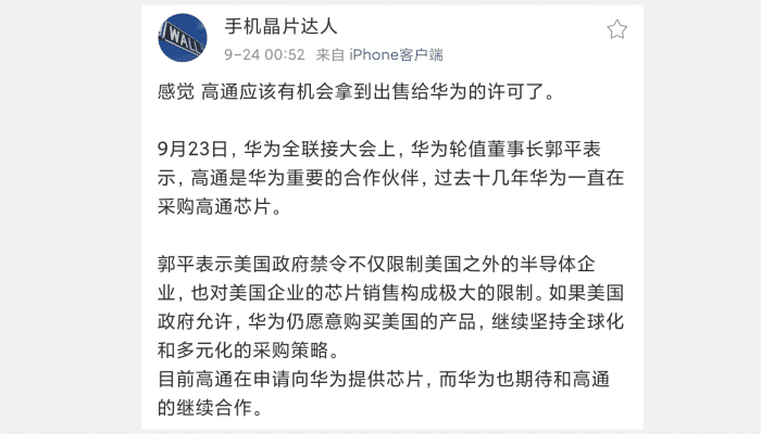 那就是高通的骁龙处理器了。在前段时间的华为开发者大会上,华为董事长郭平也明确表示,华为愿意购买高通芯片,华为手机也愿意采用骁龙处理器,但前提自然是高通被允许出售芯片给华为。近日供应链大V@手机晶片达人也暗示,高通或很快就能获得许可