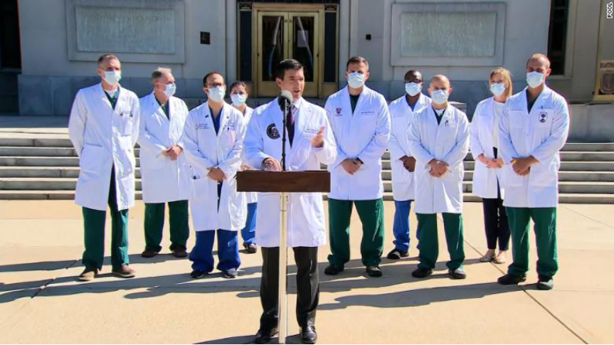 这位骨科医生出身的白宫医生,带领一个由九人组成的医疗团队:两名肺部重症监护医生,一名肺部危重病护理医生,两名传染病医生,一名麻醉师,一名临床药剂师,一名执行医学计划主任,三名护士为总统进行新冠治疗。