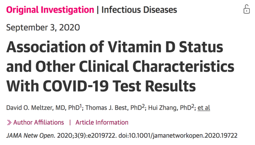 1.Meltzer DO, Best TJ, Zhang H, Vokes T, Arora V, Solway J. Association of Vitamin D Status and Other Clinical Characteristics With COVID-19 Test Results. JAMA Network Open. 2020;3(9):e2019722-e. doi: 10.1001/jamanetworkopen.2020.19722.
