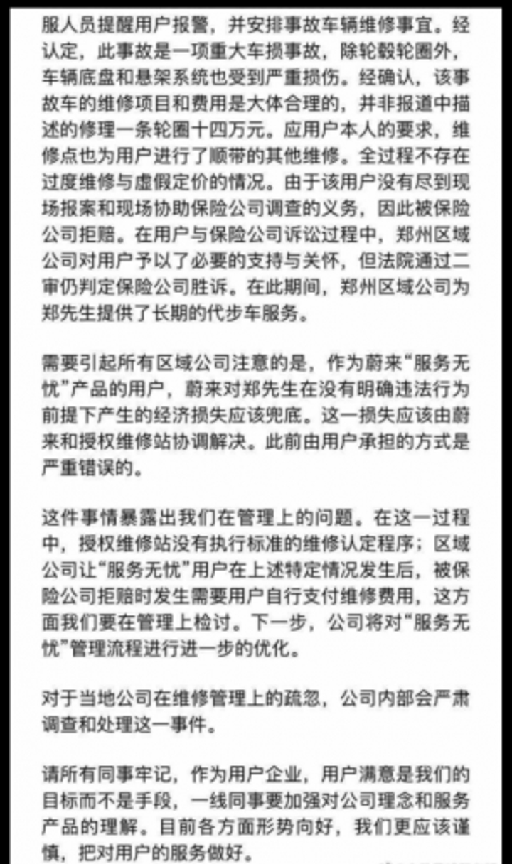 最终,太平郑州分公司对146846.17元的赔付维修费用拒绝支持,而蔚来方面承担了全部成本,郑先生只需“象征性”出一些费用即可。