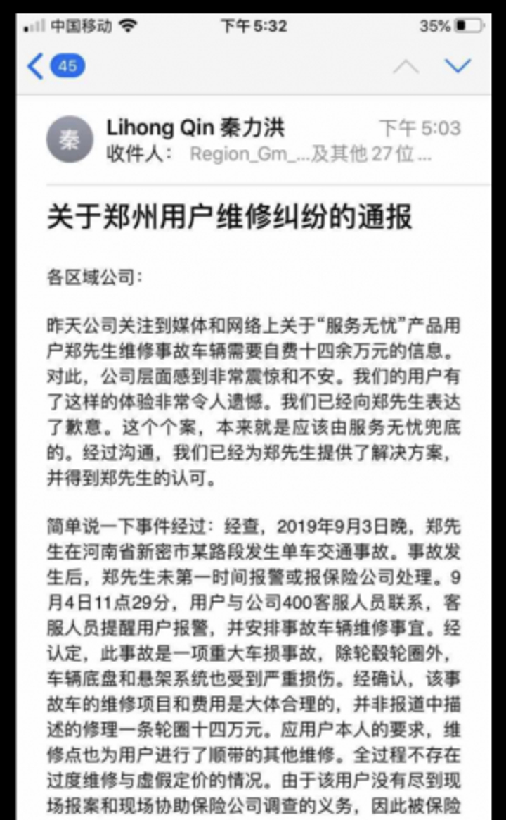 在信中,秦力洪否认了“一条轮圈十四万”的真实性,事故车除轮毂轮圈外,车辆底盘和悬架系统也受到严重损伤,故整体维修费14万属合理。