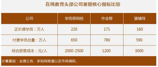 学而思网校、作业帮、猿辅导,成为目前中国K12在线教育三大巨头,各有竞争优势:学而思网校的母公司线下资源体量大,市值高;作业帮用户规模和流量优势最大,综合获客成本最低;猿辅导2020年连续两轮融资,储备了较多现金,打法激进,产品多元化,但获客成本最高。