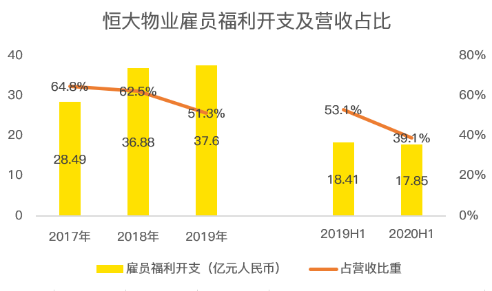 恒大物业2017年至2019年,员工福利开支分别为28亿、37亿和37.6亿,占营收比重分别为64.8%、62.5%和51.3%。