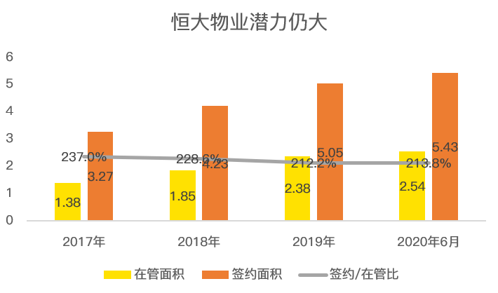 目前,恒大物业在管面积2.54亿平方米,签订合约的面积为5.43亿平方米,合约/在管比为213.8%,接近碧桂园服务233%的水平,处于行业前列。