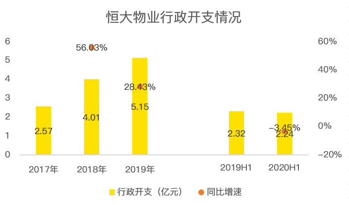 除此之外,恒大物业行政开支费用也控制的十分优秀,不增反减,今年上半年较上年同期相比下降了3%,而碧桂园服务同比增长51%,融创服务6%,正常情况下,随着业务规模的扩大,行政费用增加不可避免,恒大物业的情况远远不可持续!