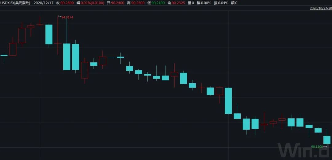 议息会议公布后,美元指数触底反弹,不过冲高后又再次回落。截至收盘,美元指数跌0.4%报90.22。而盘中美元指数达到90.13创两年多新低。