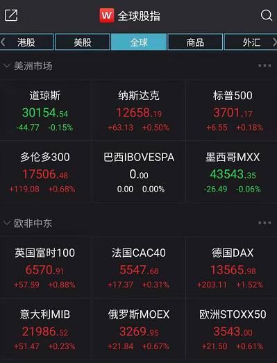 美股有明显拉升,不过收盘涨跌不一。Wind行情显示,道琼斯工业指数盘中翻红,随后有所回落,最终收跌0.15%。而纳斯达克指数基本高开高走,最终涨0.5%,继续创新高。另外标普500也较强,以上涨0.18%收盘。此外欧洲三大股指表现都很强,德国DAX涨1.52%,英国富时100涨0.88%,法国CAC40涨0.31%。