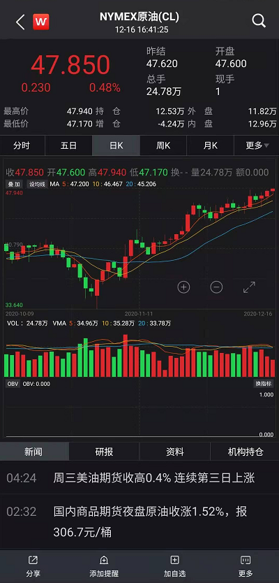 大宗商品方面,国际油价、黄金均纷纷走高。其中NYMEX原油收涨0.48%报47.85美元/桶,继续缓慢创阶段新高。