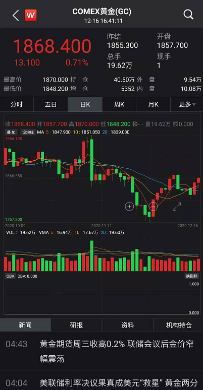 而COMEX黄金也小幅上涨0.71%,报1868.4美元/盎司,继续在1850美元/盎司上方震荡。