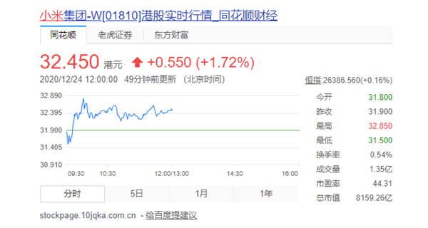 12月24日,小米股价继续高开,盘中涨2.82%,报32.8港元。截稿前,回调至32.450港元,总市值8159.26亿港元。