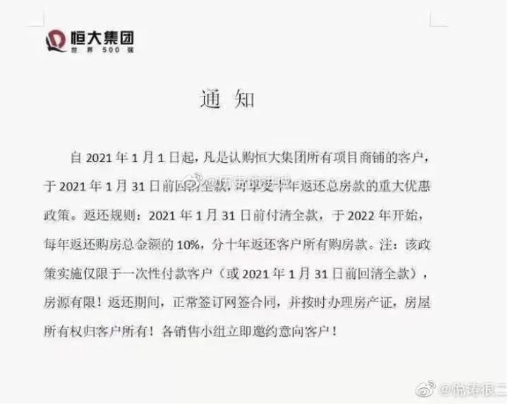 据截图显示,2021年1月1日起,凡是认购恒大集团所有项目商铺的客户,在2021年1月31日前回清全款,可享受十年返还总房款的重大优惠政策。