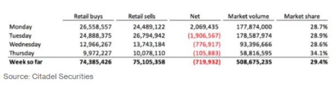 但最诡异的是,从Citadel看到的数据,散户居然是从周二就开始净卖空GME (周三以后也是净卖空,但不排除散户被迫平仓而distort data)。所以散户真的是在疯狂做多么?
