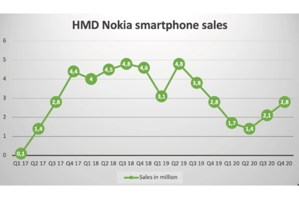 根据市场调研机构Counterpoint Research透露,HMD Global在10月至12月期间出货了277万部诺基亚品牌智能手机,市场份额为0.7%。虽然这个成绩并不亮眼,但是HMD在第四季度确创造了2020年的最佳业绩,总出货量与去年同期相比也几乎没有变化。