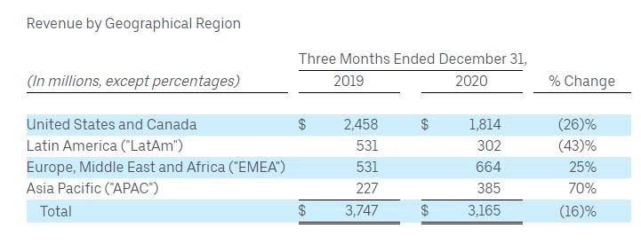 按地区划分,Uber第四季度来自美国和加拿大地区的营收为18.14亿美元,与上年同期的24.58亿美元相比下降26%;来自拉丁美洲地区的营收为3.02亿美元,与上年同期的5.31亿美元相比下降43%;来自欧洲、中东和非洲地区的营收为6.64亿美元,与上年同期的5.31亿美元相比增长25%;来自亚太地区的营收为3.85亿美元,与上年同期的2.27亿美元相比增长70%。2020财年全年业绩: