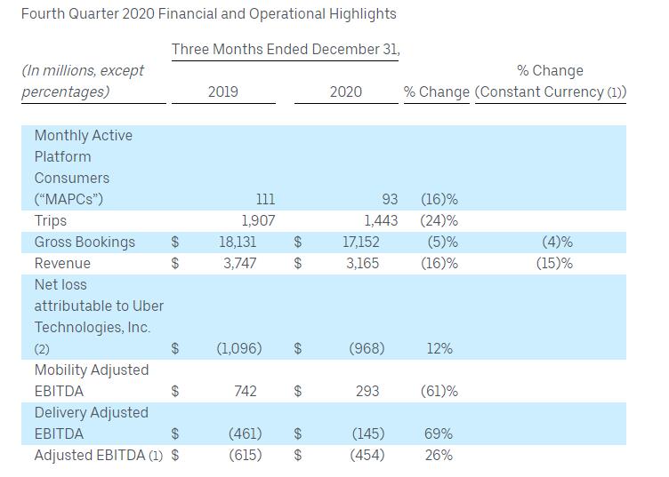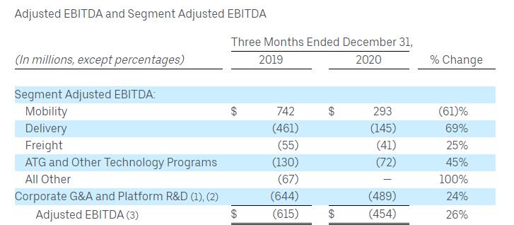 Uber第四季度调整后EBITDA(即未计入利息、税项、折旧及摊销的净利润)为-4.54亿美元,相比之下上年同期为-6.15亿美元。