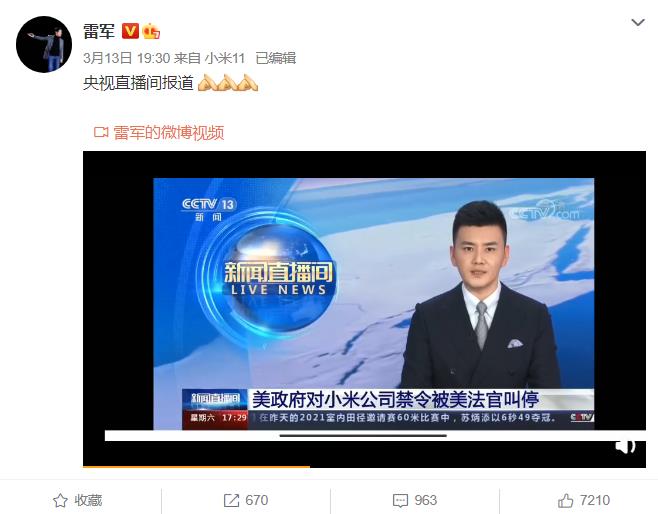 原来在今年一月份小米被漂亮国盯上,并把小米列入了制裁名单。随后小米开始起诉漂亮国,认为他们的作为是毫无依据的。在3月13日这一天好消息传来,小米起诉漂亮国取得实质性进展。因此这个事件也登了《央视新闻》并且《央视新闻》对该事件进行了全景的回复和报道,并且声明了我国的态度等等。看到了这个报道雷军第一时间就转发了《央视新闻》关于小米事件的报道,目的是让大家明白这个事件的整体经过以及处理结果等等。