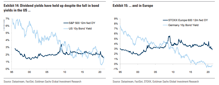 如今,在美国,股息收益率和10年期债券收益率非常接近,如果考虑到股票回购,债券的收益率实际上更高。同时,在欧洲这样的重视价值股和周期股的市场上,股息率和债券收益率差距仍然很大,这表明人们对未来的增长仍持怀疑态度。