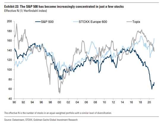目前,在全球市场,市场集中度毫无疑问在上升,特别是在美国股票市场。Herfindahl指数(一种集中程度的衡量标准)显示,美国股票市场的多元化程度低于正常水平。但是,少数占据市场很大份额的公司拥有主导地位,也不代表一定存在泡沫。