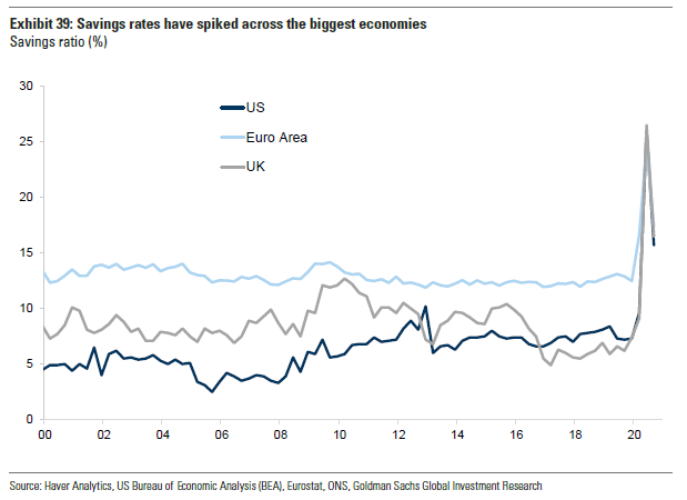疫情期间,美国家庭占货币市场基金总流入量的40%(4100亿美元),此后约占流出量的70%(2000亿美元)。高盛估计,在几轮纾困方案之后,美国和主要发达经济体居民的资产负债表实际上也非常强劲。高盛预计,当今年年中疫情逐渐趋缓、生活正常化开始时,美国居民存款将达到2.4万亿美元,约占GDP的11%。