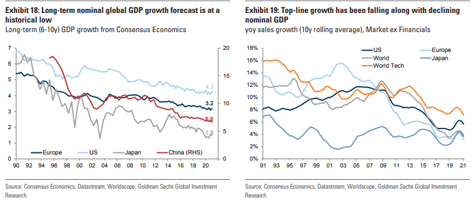在2000年技术泡沫破灭之后的通货紧缩时期,特别是自全球金融危机以来,长期名义增长预期有所恶化(但是,要注意是,股票与长期名义GDP挂钩)。此外,自金融危机以来,所有主要股票市场的平均收入增长都出现了显着恶化,并且存在长期的“长期风险”。