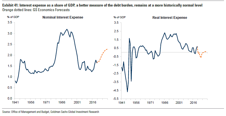 政府债务方面,尽管欧美政府债务绝对值在迅猛增加,但是,债务孳息占GDP的比重,和上世纪80、90年代相比,依然比较低。