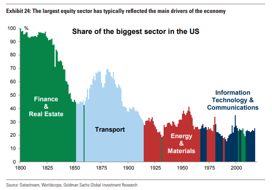 从历史上来看,市场由新兴的、正在经济转型的行业主导,或者少数公司成为快速增长的行业的主导者时,股票的市场集中度的提高并不罕见。历史上市值最大的板块通常都反映了当时经济的主要驱动力,而且在过去,主导板块的市值占整个股市的比重比今天更大。