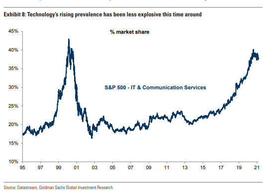 来看目前主要股票市场中表现最好的标准普尔500指数中的科技板块,尽管,过去几年的涨势令人印象深刻,但该板块的涨幅并没有1990年代末期互联网泡沫时期那么极端。