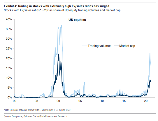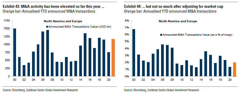 高盛得出结论,尽管非常宽松的货币和财政政策是泡沫滋生的肥沃土壤,但美国私人部门的负债情况并未恶化,银行业的强劲资产负债表也降低了泡沫可能出现的风险。6. 企业疯狂的交易活动