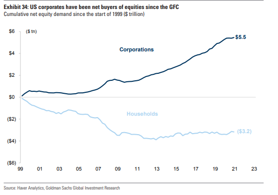 而且,在金融危机之后,美国股市的净买家是企业,居民是净卖家。