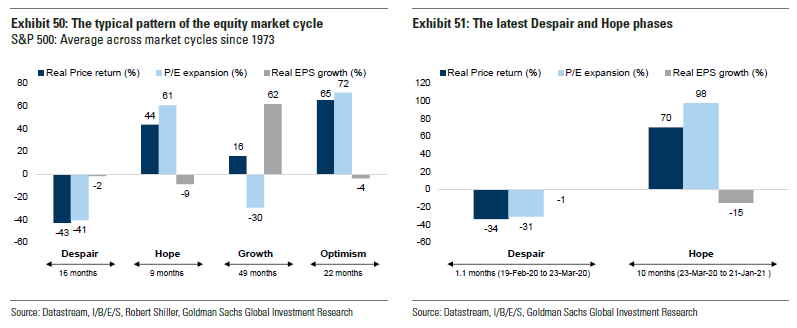 高盛不这么认为。高盛称,去年3月至9月股市的反弹,是典型的牛市启动阶段投资者开始出现“希望”的表现。目前,股市则处于新周期的“成长”阶段。