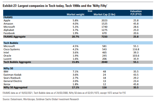 尽管目前科技巨头占有的市值比例已经超过了20%,但是从市盈率来看,目前的FAAMG和70年代的“漂亮50”、1990年代末的互联网泡沫巨头相比,依然要低很多。
