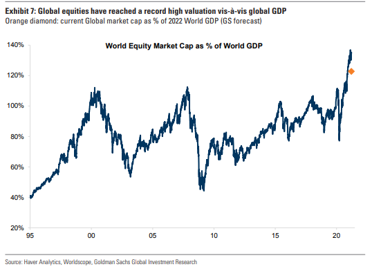 此外,全球股市的市值占全球GDP的比重已经达到历史新高,也高于高盛此前的预期(下图中的橙色菱形)。