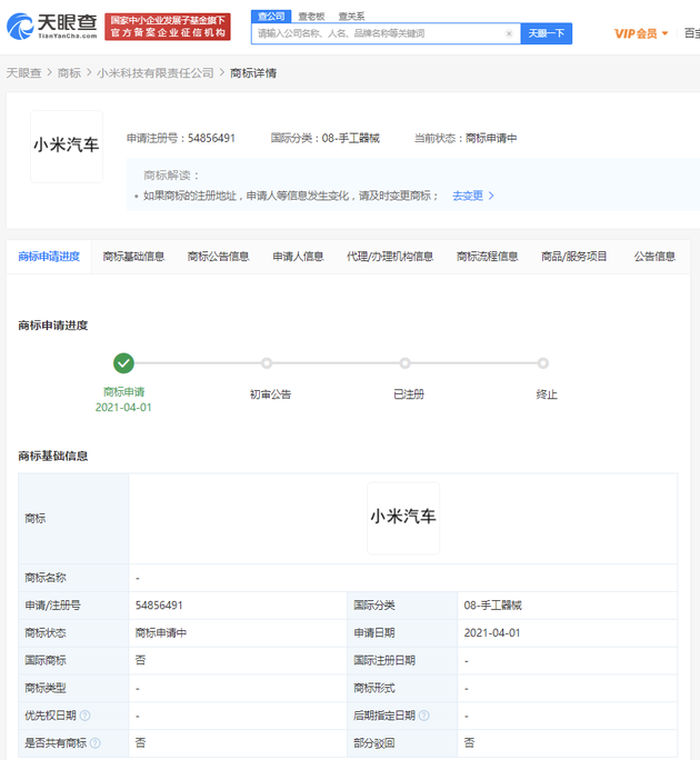 天眼查App显示,4月1日,小米科技有限责任公司申请注册“小米汽车”商标,国际分类为手工器械,注册号54856491,目前商标状态为商标申请中。