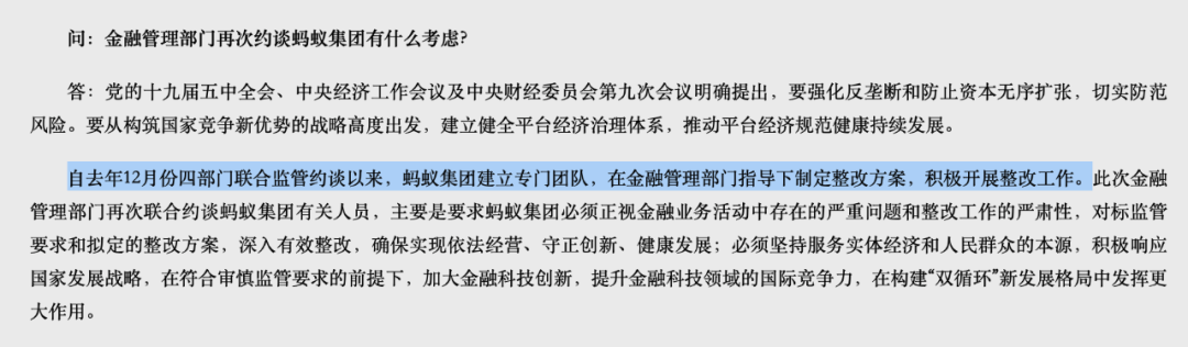 而这一次,金融管理部门公布的约谈过程中,对蚂蚁态度的评价明显就温和了不少,称“蚂蚁团队积极开展整改工作”。